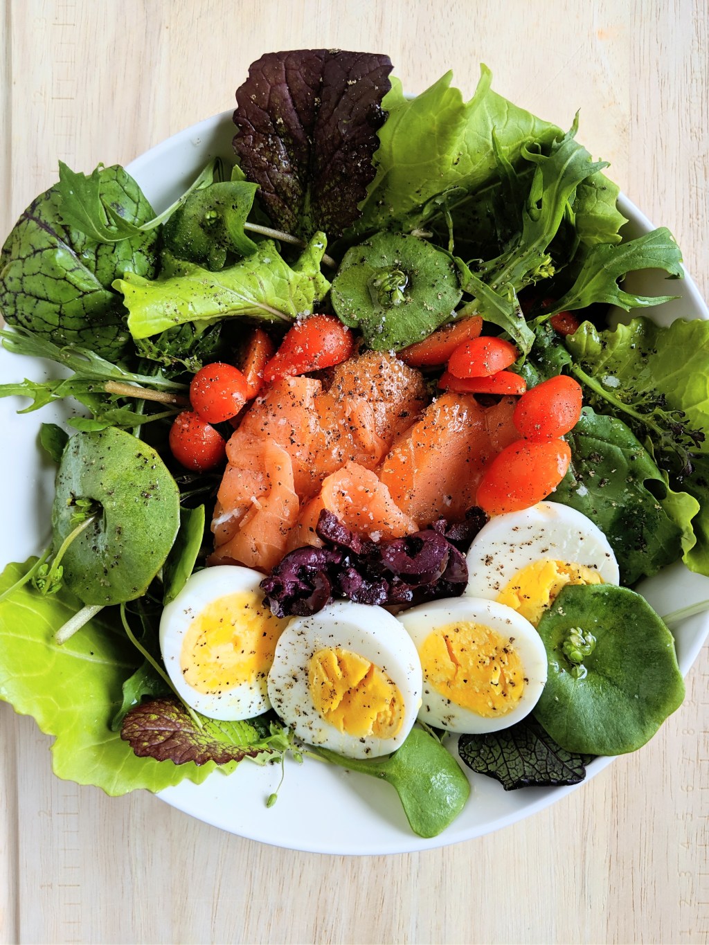 Wash and gently dry the spring greens and arrange them on a serving plate or bowl. Thinly slice the smoked salmon and place on greens. Half the boiled eggs and add to salad plate. Garnish with halved cherry tomatoes and diced olives. Drizzle the olive oil and lemon juice over salad and add salt and pepper to taste.